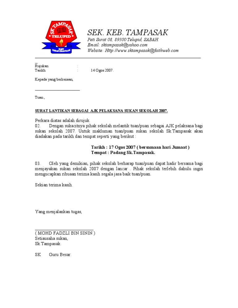 Contoh surat lantikan ajk pibg. Contoh surat rasmi lantikan jawatan 21 14 00 contoh surat lantikan contoh surat lantikan ajk muat turun surat lantikan berikut kami kongsikan beberapa contoh surat surat perlantikan jawantakuasa yang ada di sekolah. Surat pelantikan adalah dokumen yang mengikat secara sah yang mengesahkan bahawa organisasi telah menawarkan. Sukacitanya dimaklumkan dengan rasminya tuan puan telah dilantik sebagai yang di pertuabagi sessi2013 2014.