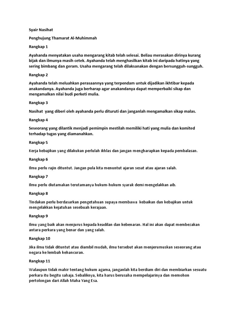 Bahasa Melayu Tingkatan 2 Syair Nasihat Penghujung Thamarat Al Muhimmat