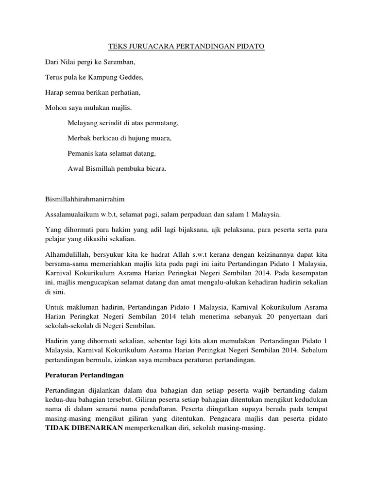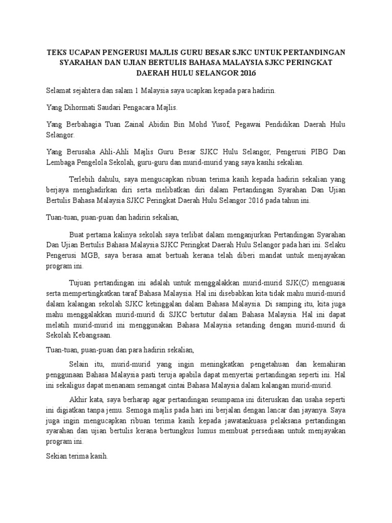 Teks ucapan pengerusi majlis semasa pertandingan pidato terbuka satu malaysia peringkat institusi pengajian tinggi negeri sabah 2011. Selepas majlis diserahkan semula kepada pengacara majlis. Teks pengacara majlis pertandingan pidato integriti peringkat ipgktb kampus tuanku bainun 2014 selamat pagi salam sejahtera dan salam berpidato. Pengacara majlis dan peserta pidato tidak dibenarkan memperkenalkan diri sekolah masing masing.